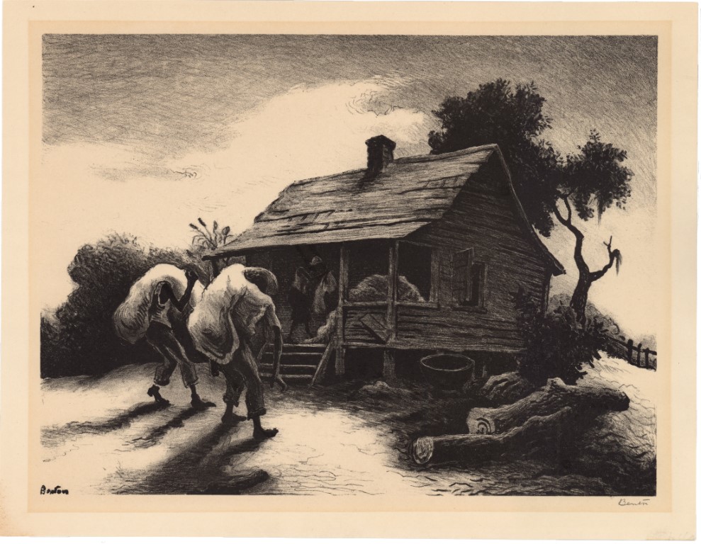 Two people walking toward a small, clapboard cabin with large (cotton?) sacks on their backs. There is another person holding an empty sack on the front porch. There are two logs on the ground to the right of the cabin and and tree behind it. LL in print "Benton" LR in pencil - "Benton"