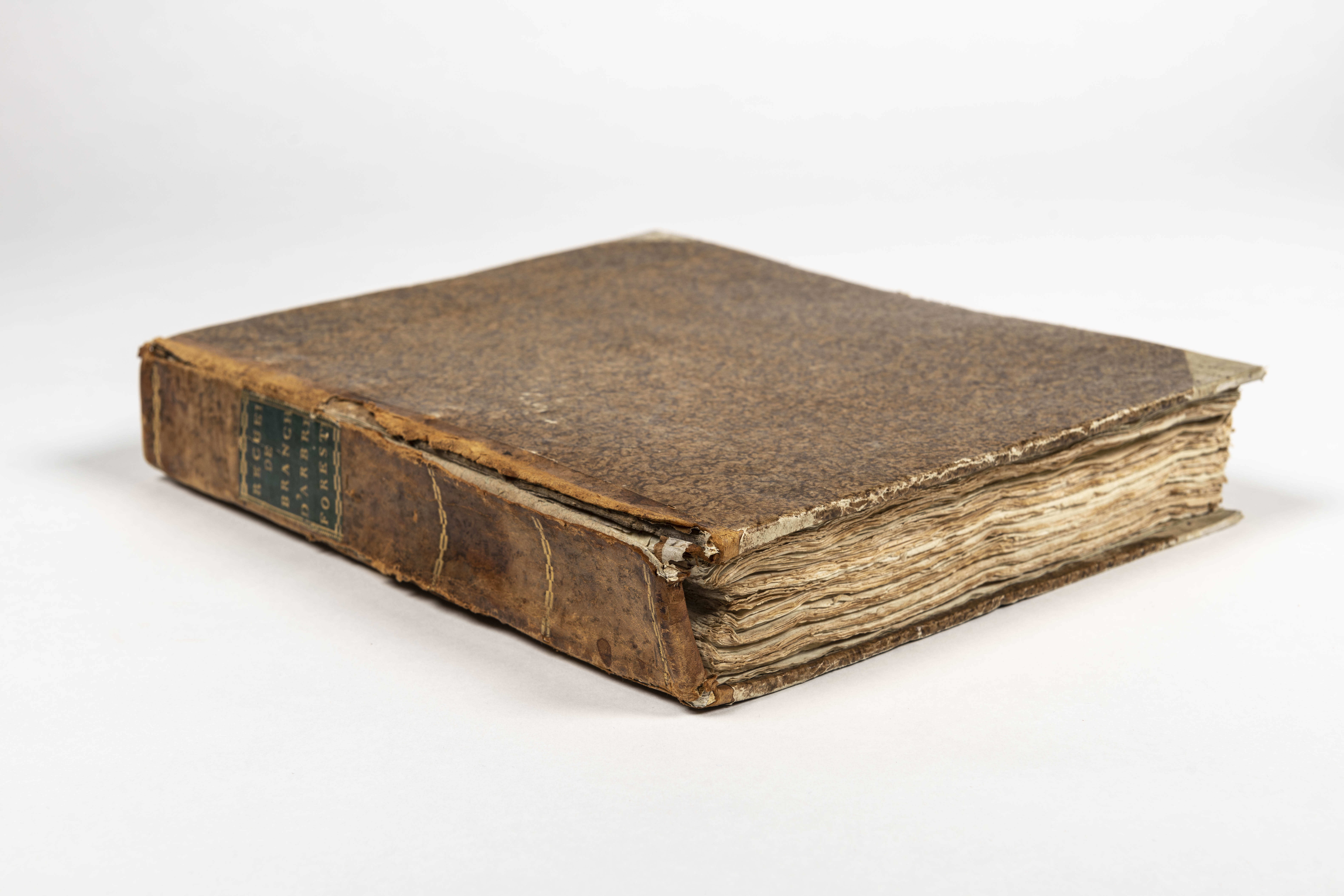 Brown tinted paper covered book with brown leather spine. Black rectangle with gold lettering on spine "Recueide Brankch D'Arbre Forest"