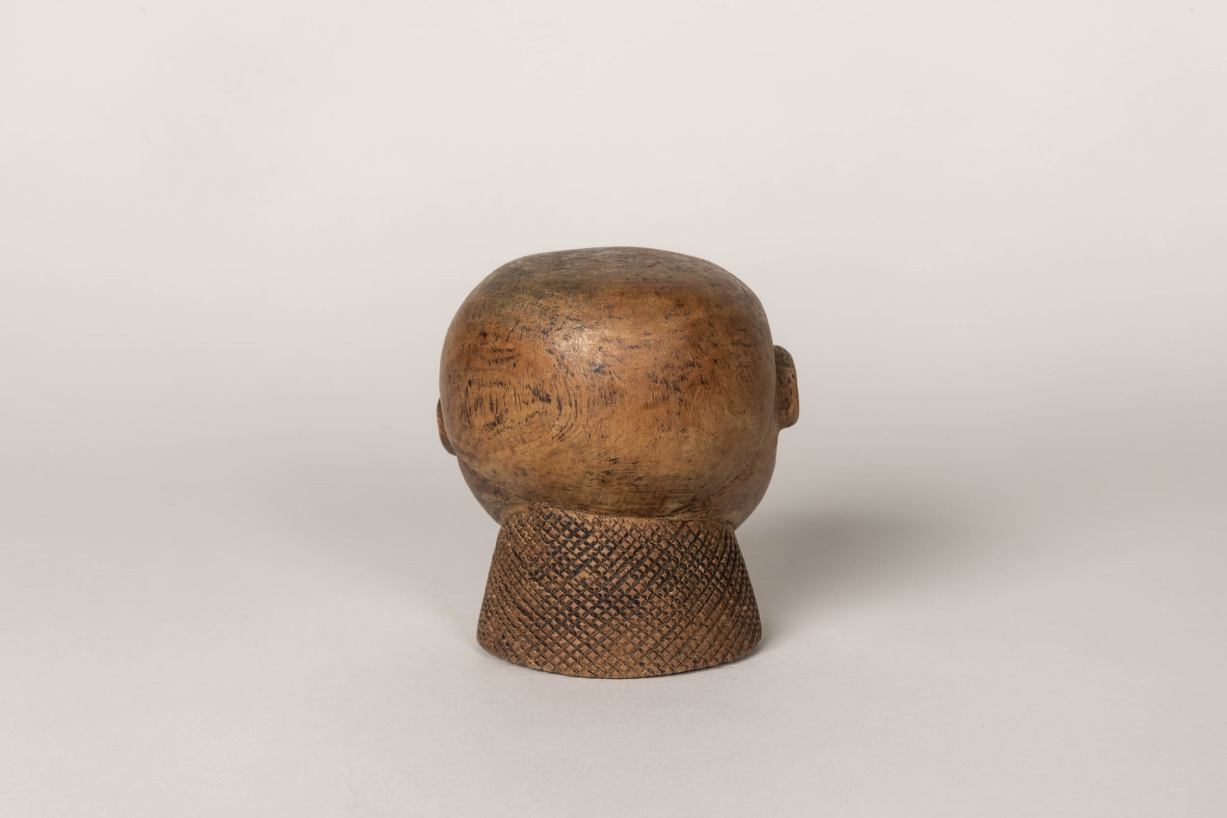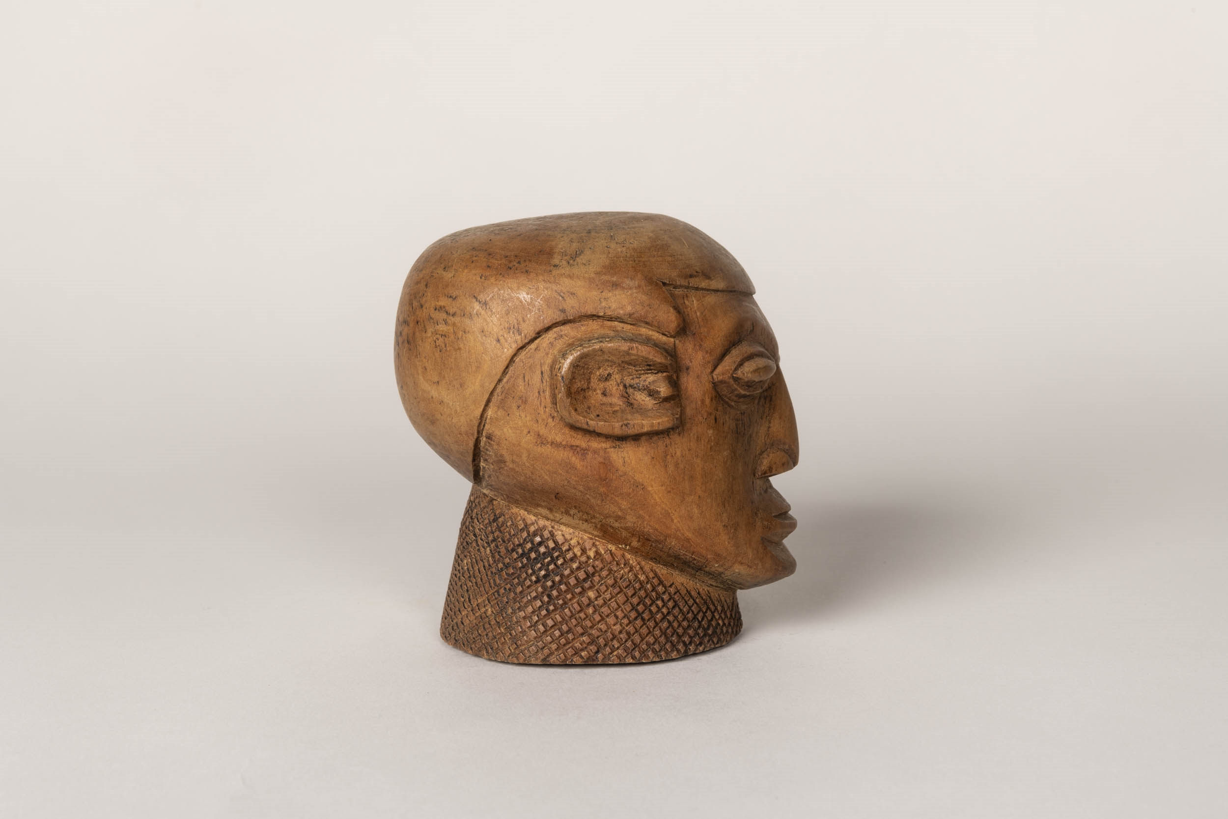 wood head sculpture, medium brown. Curved hairline carved into forehead separates face from smooth "hair" section. Face articulated with almond-shapes eyes and eyelids, triangular-shaped nose, mouth, ears, and chin. Neck base carved with cross-hatched diagonal lines.