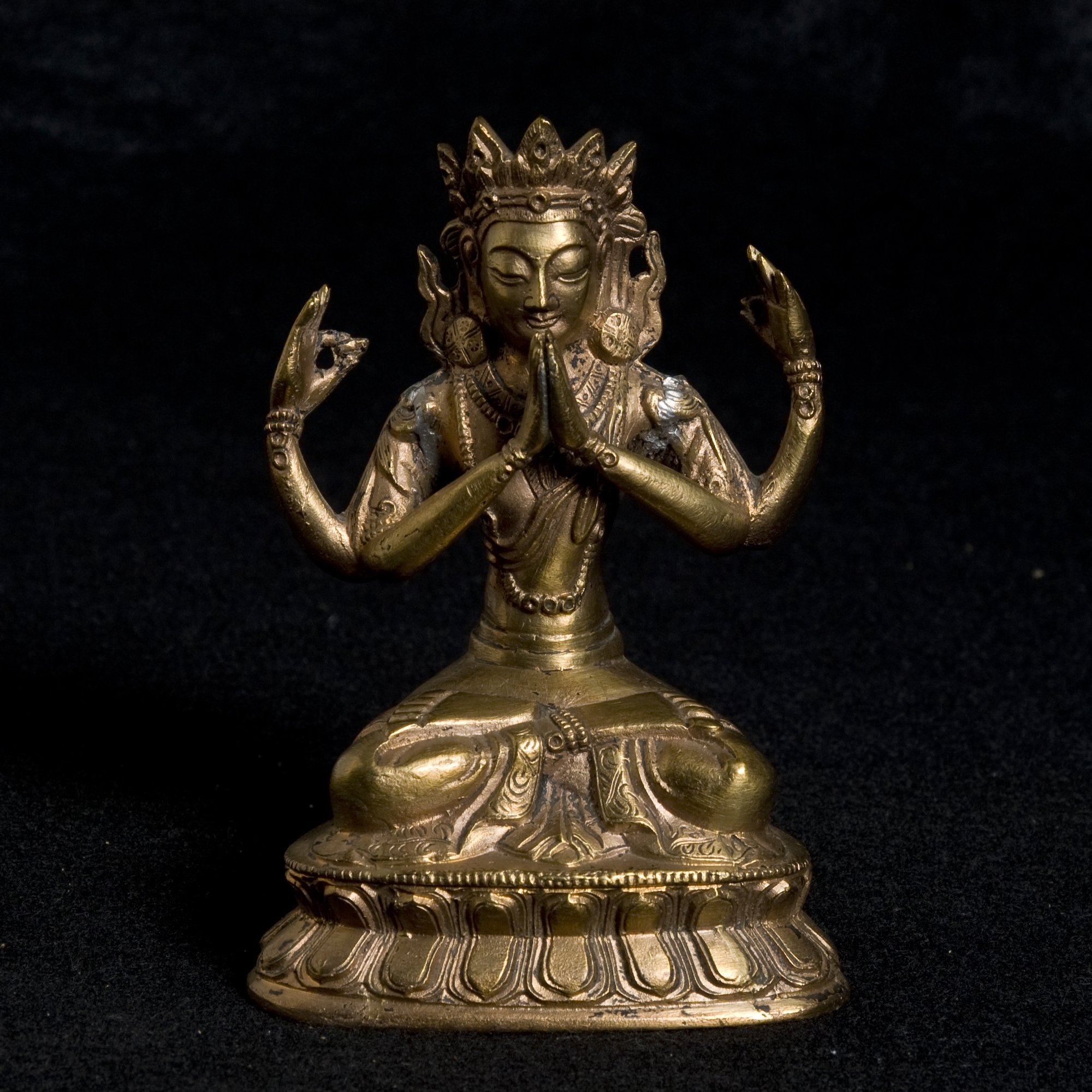 Seated on a double lotus pedestal base, secondary hands holding a flaming jewel, primary hands clasped in prayer, wearing a five-pronged lotus crown