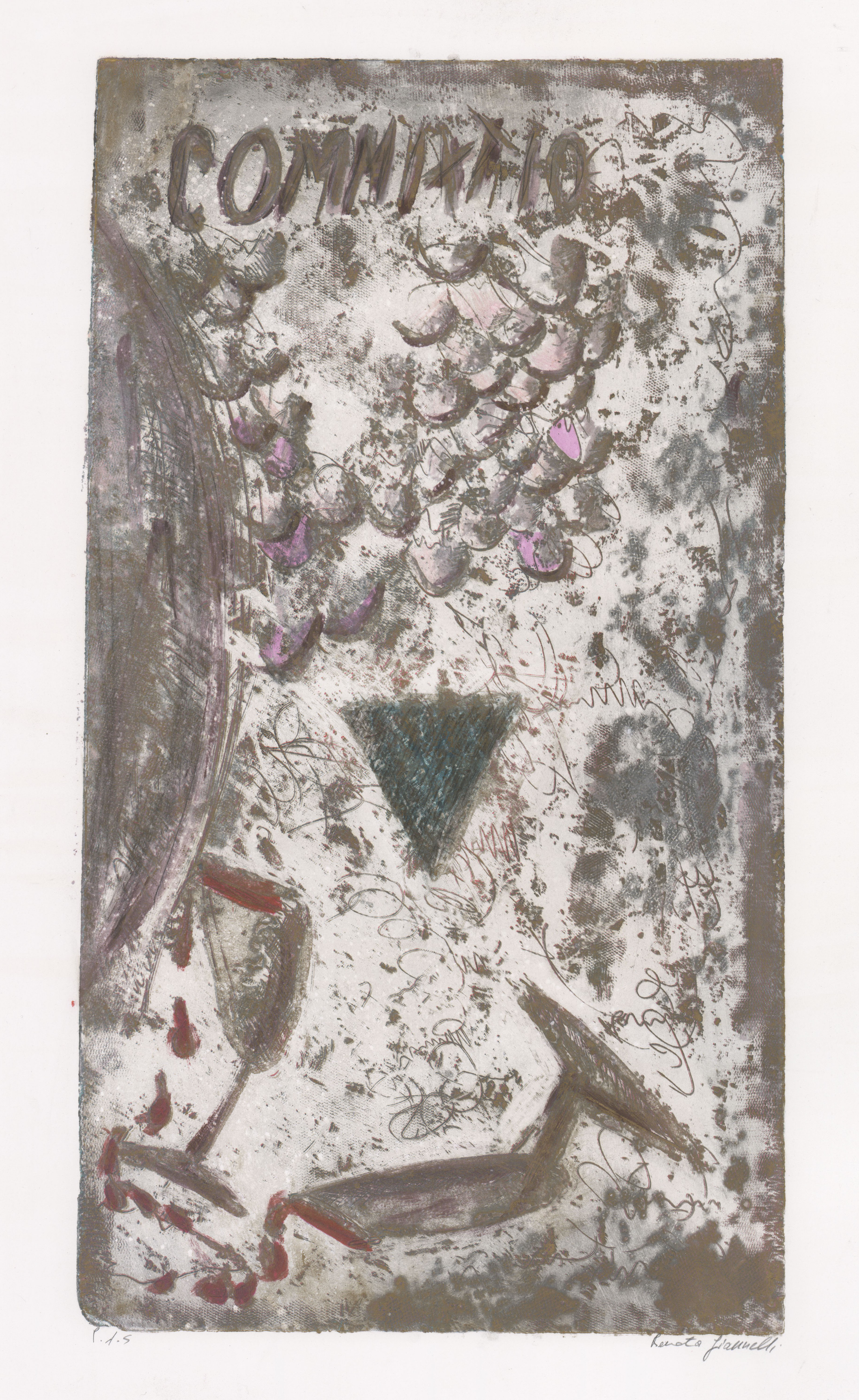Vertical; "Commixtio" -top corner; brown, white, and pink abstract