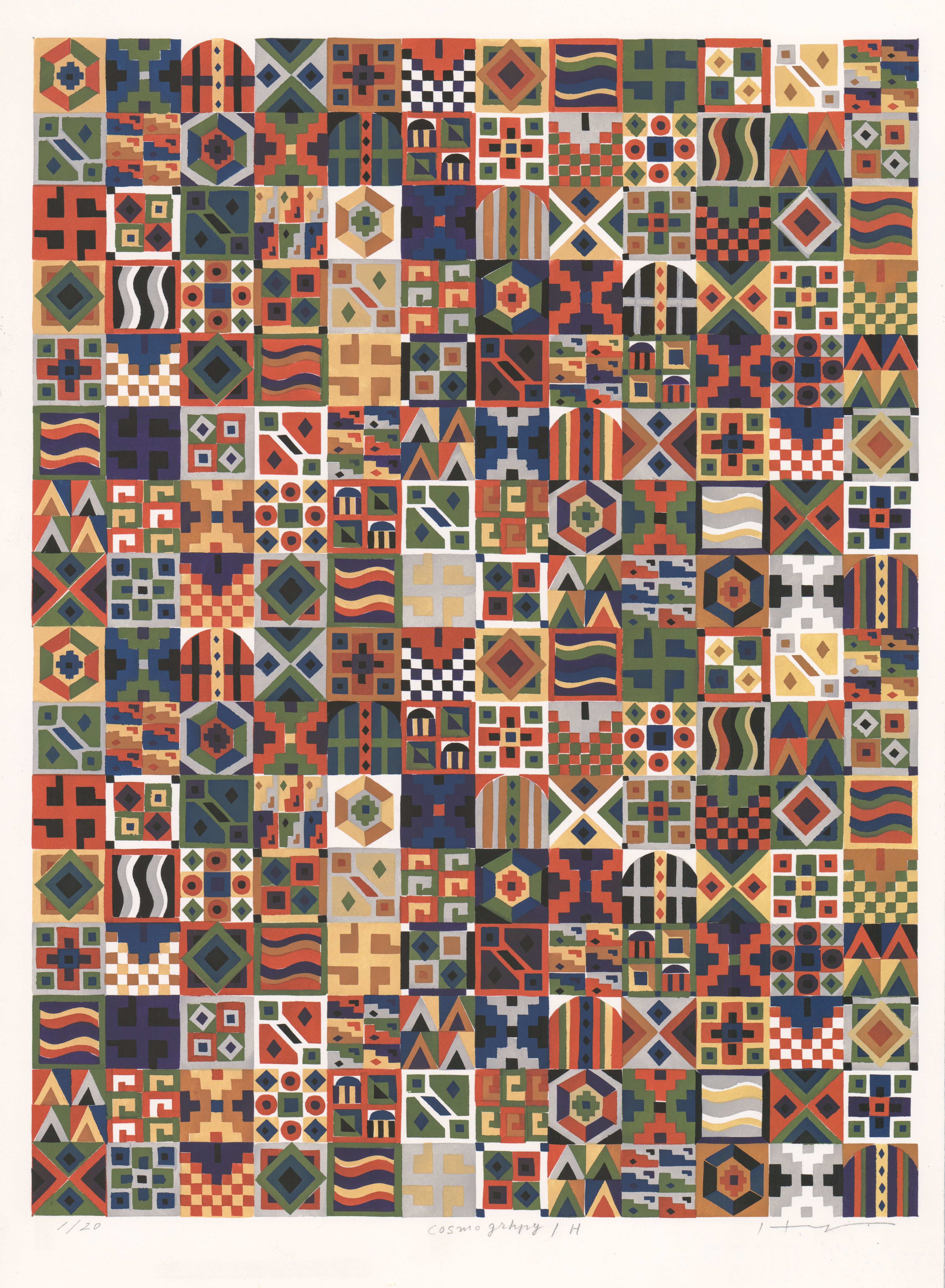 Vertical; squares with colorful patterns inside; grid arrangement; white negative space Edition: 1/20