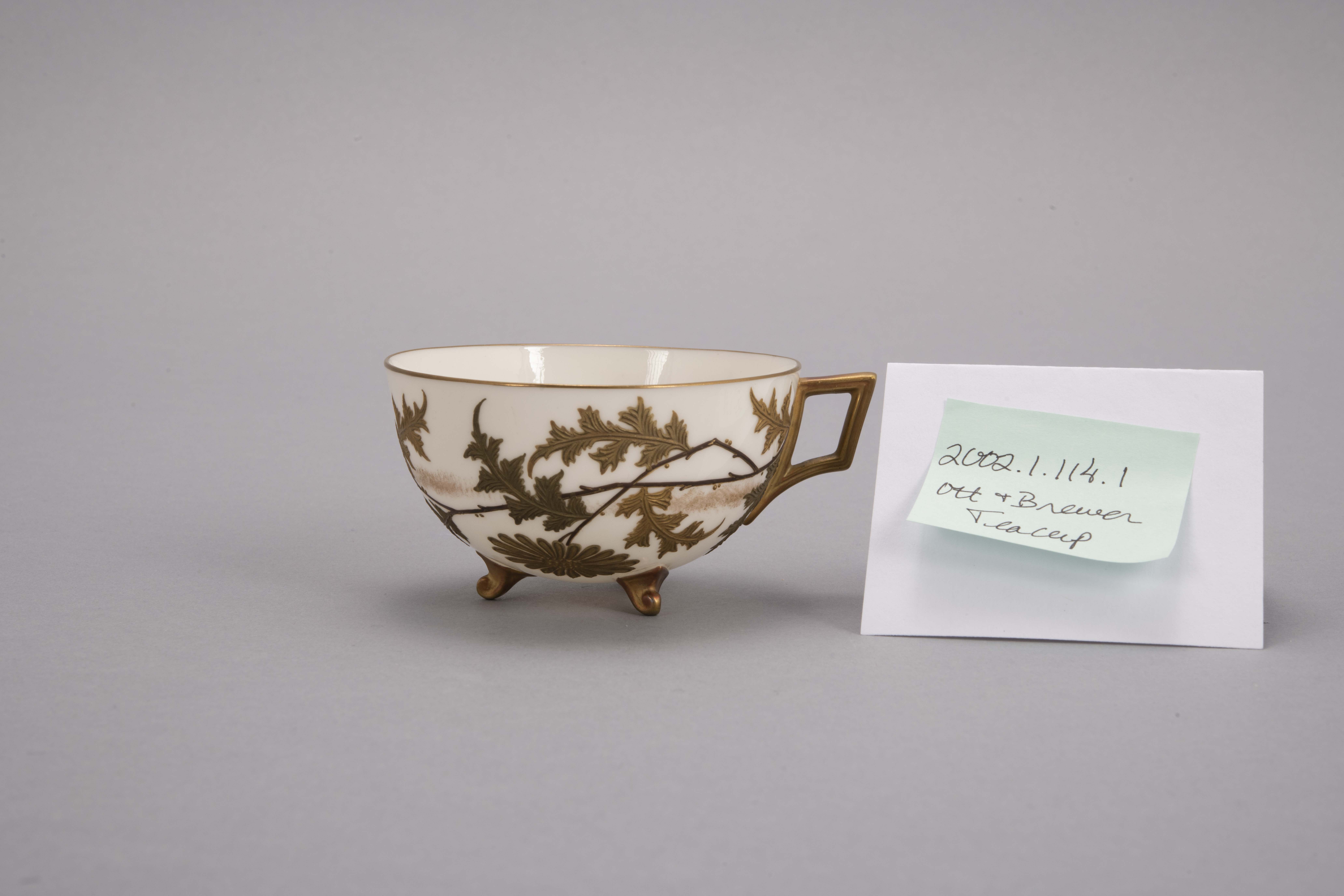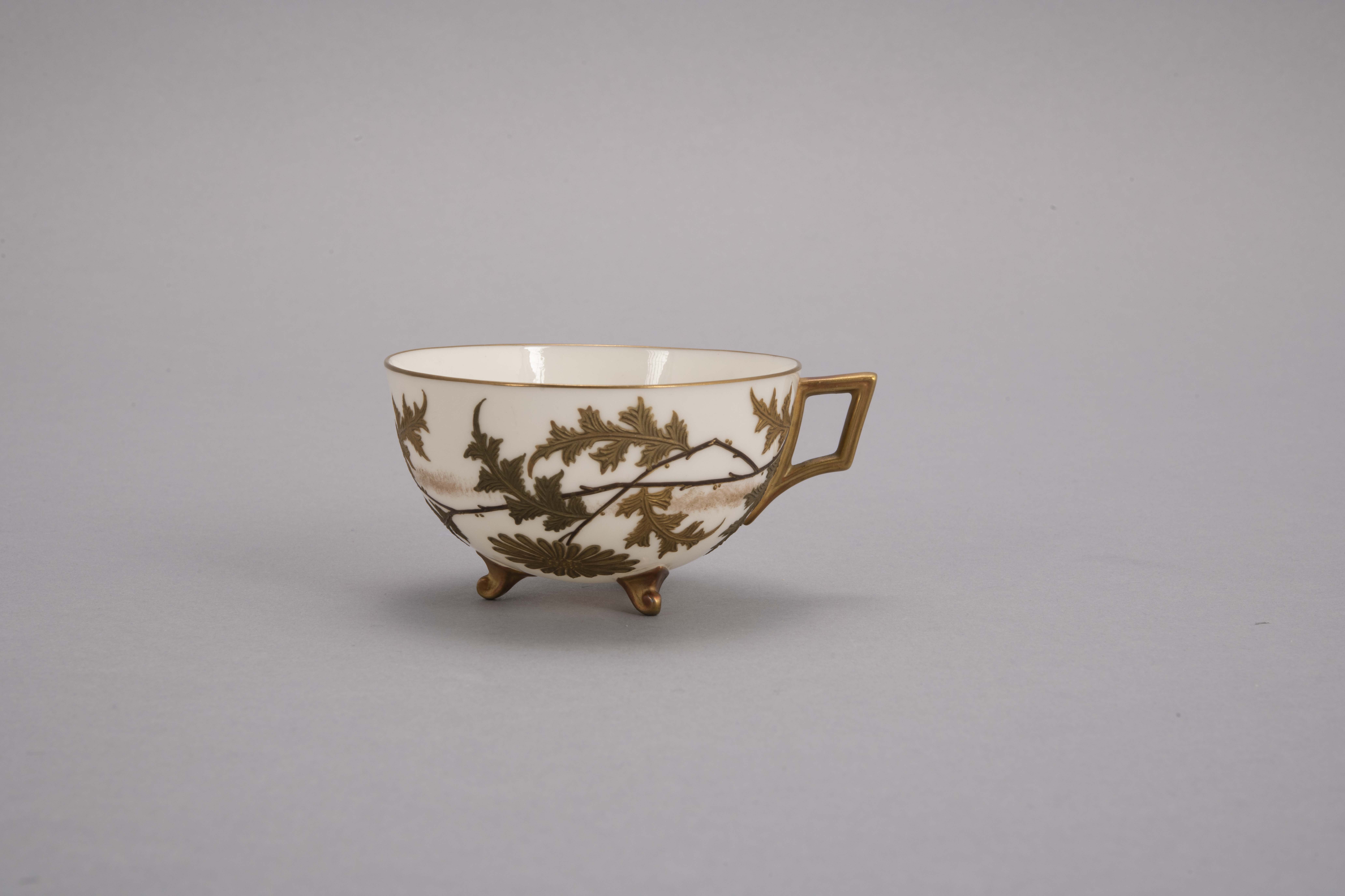 Unidentifiable porcelain White cup with smooth finish and high relief gold decoration; dragonfly and flowers; footed