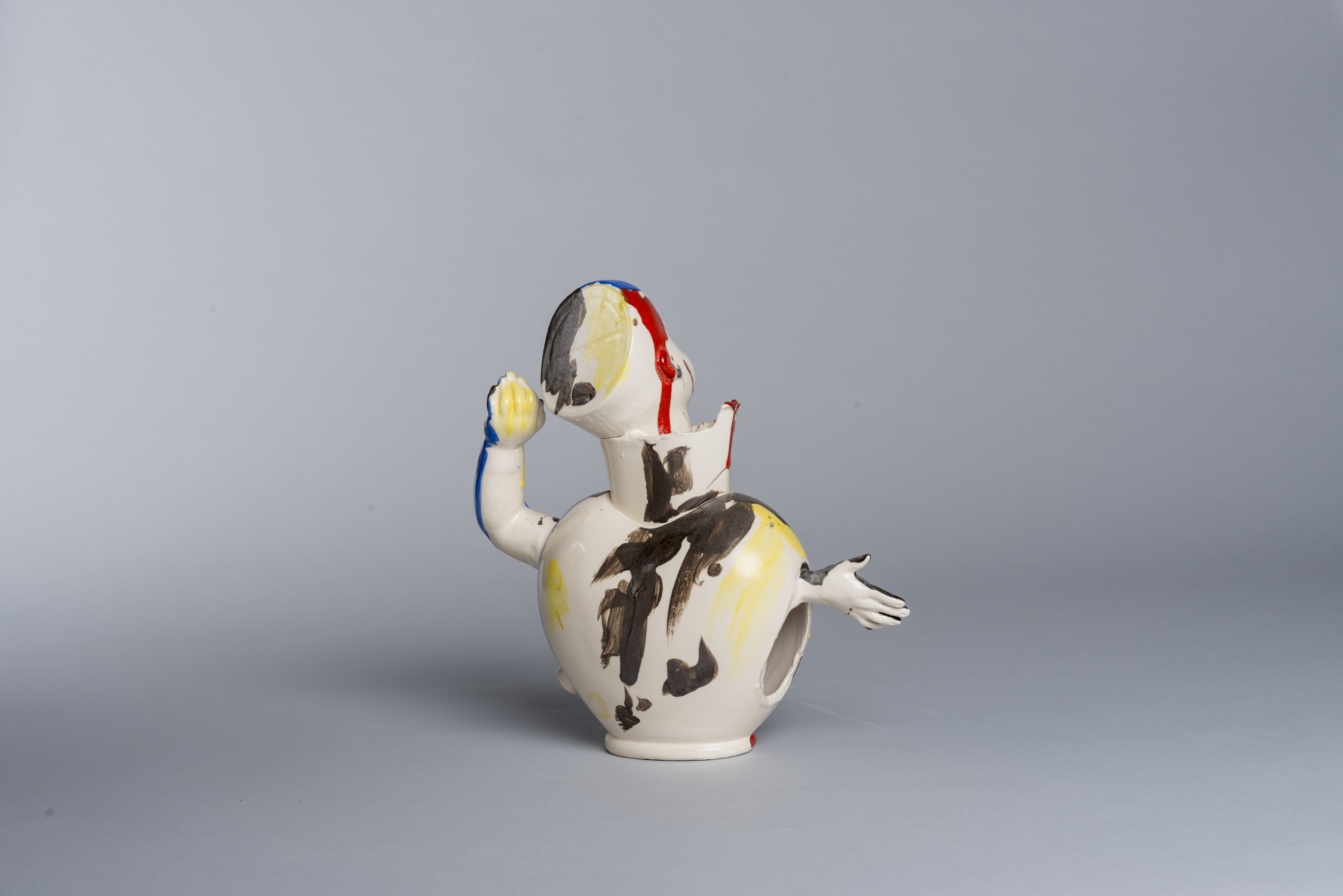 Multi-colored (red, blue, yellow, black, etc.) drip paint teapot with almost heart-shaped body with off center doll head atached on top, arms/hands on either side