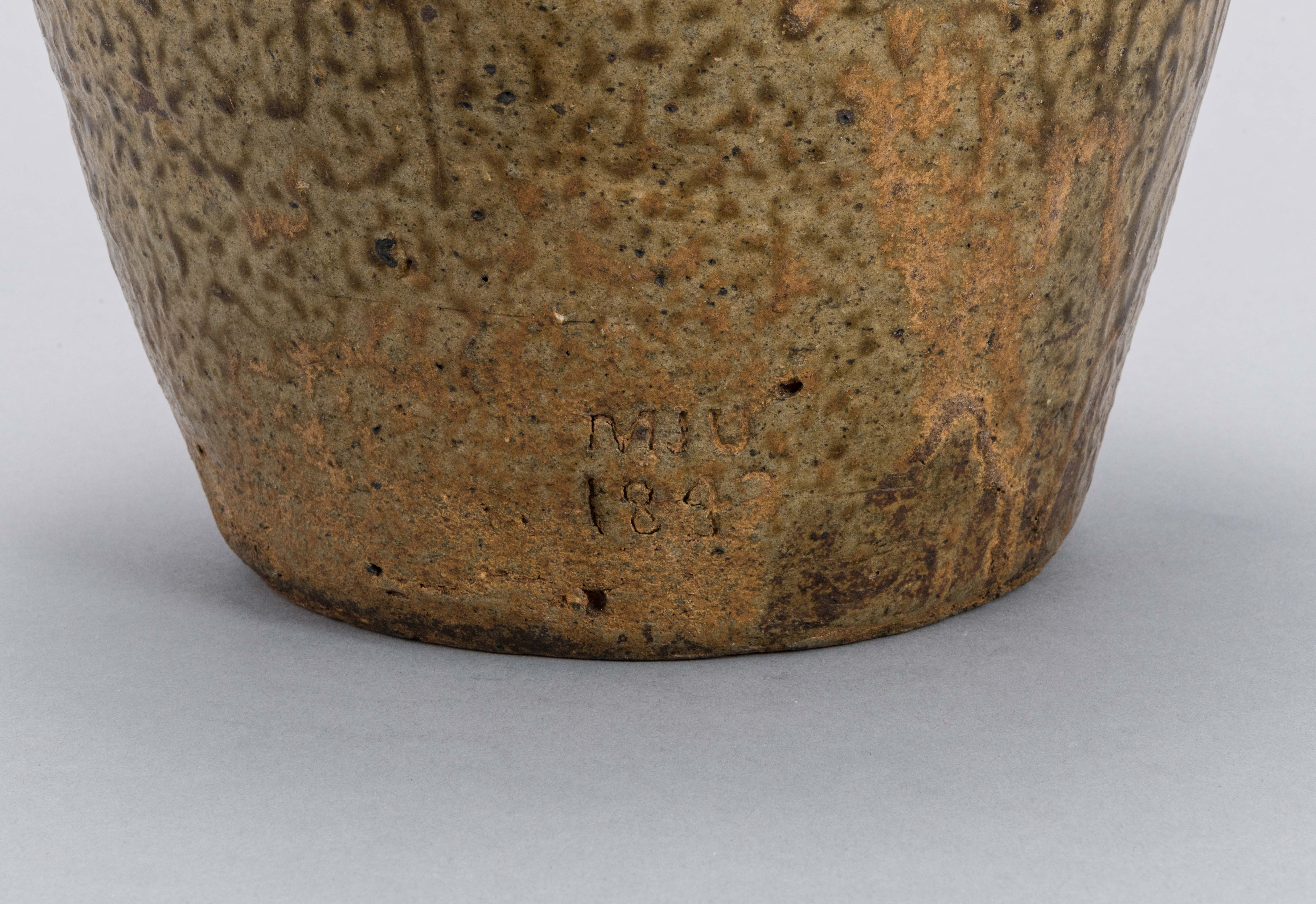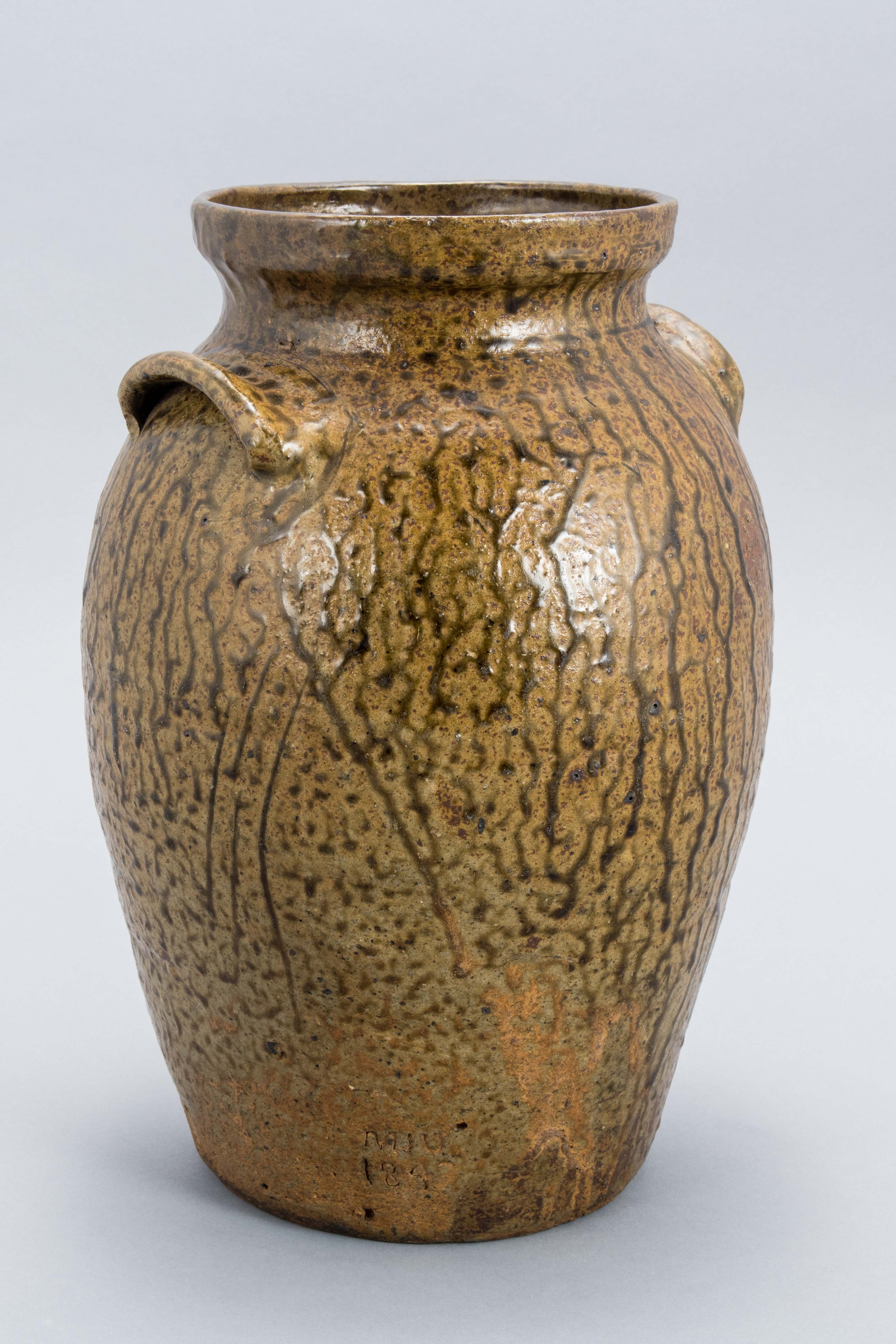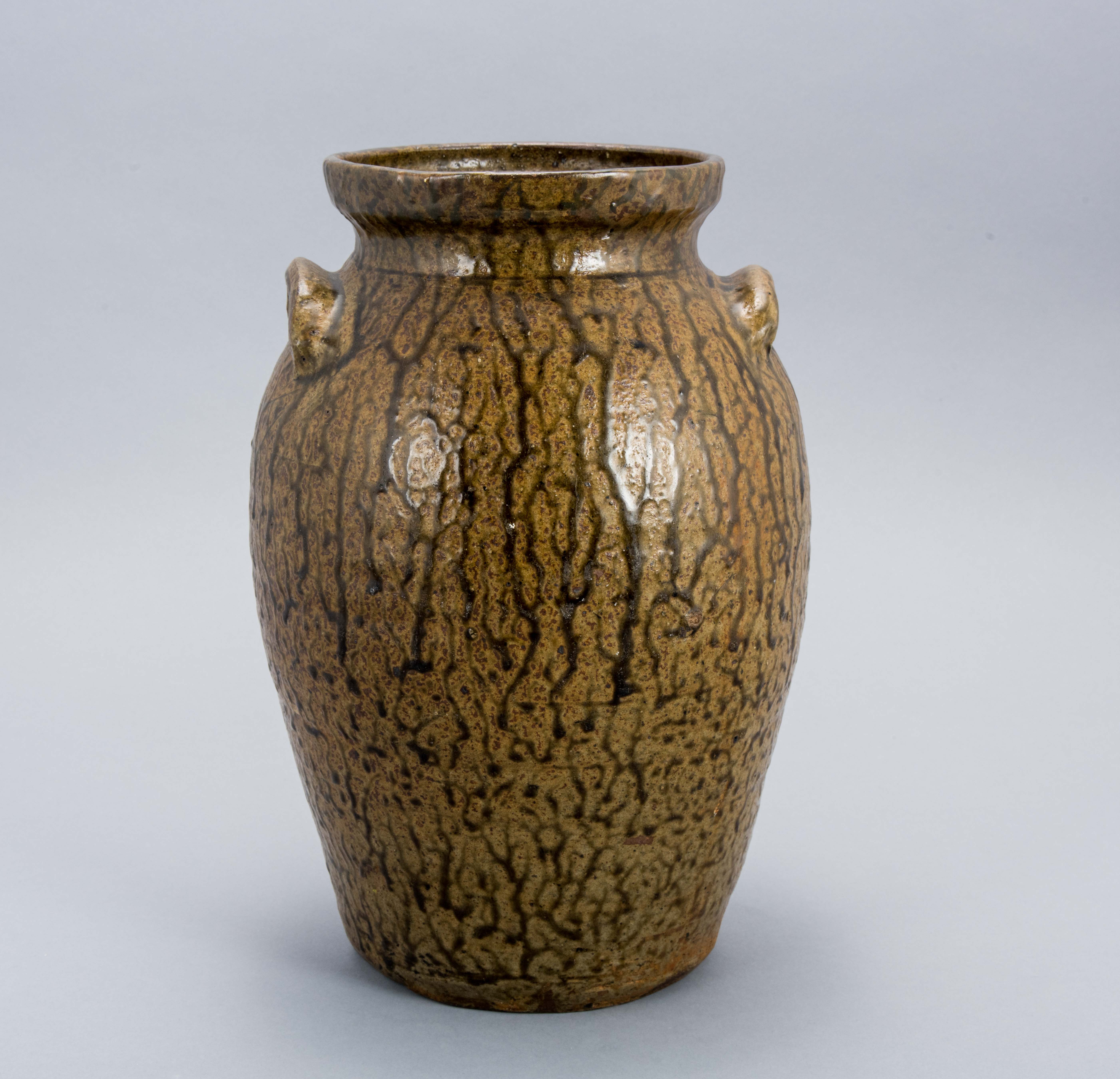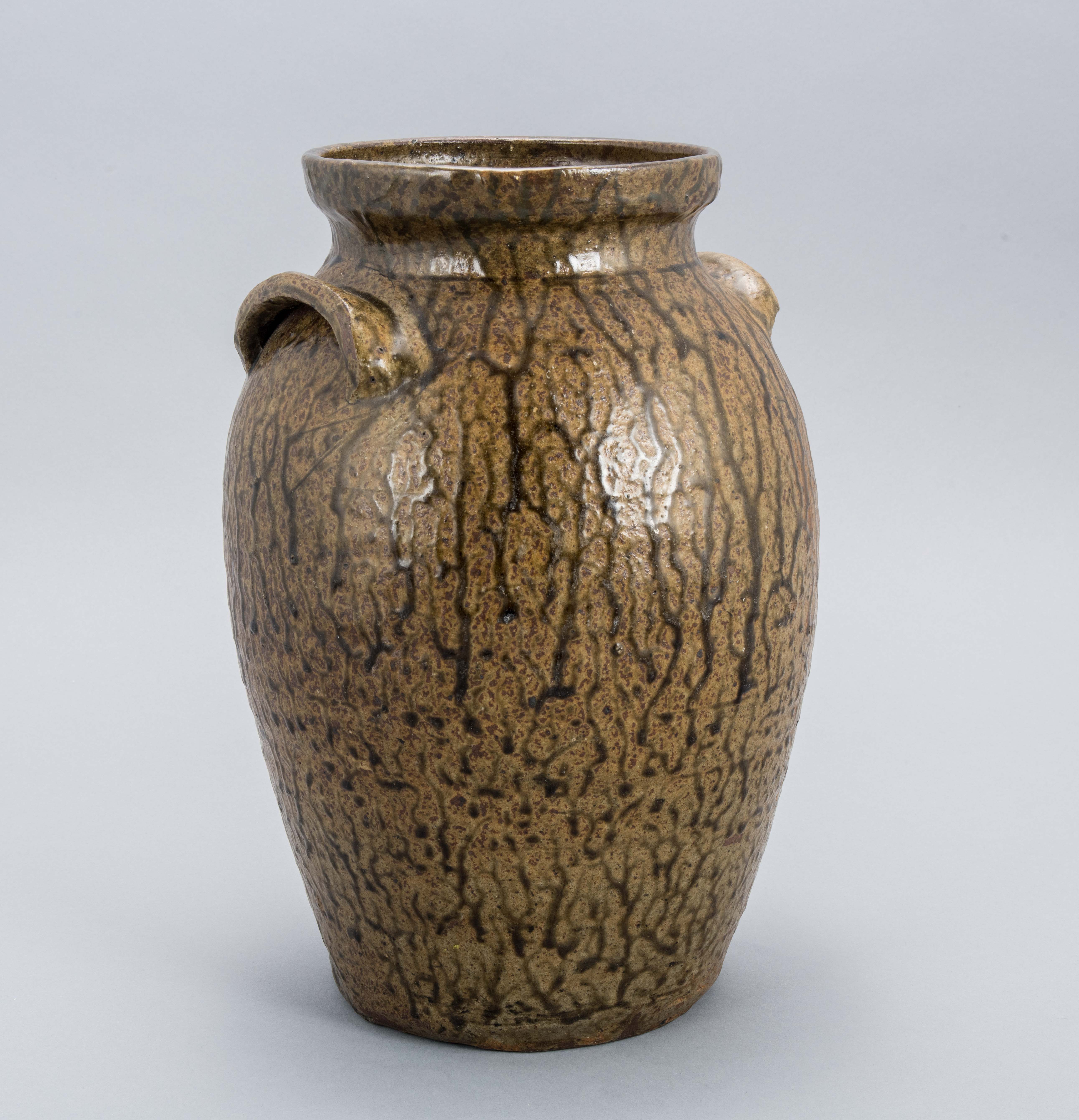Lug-handled jar with brown "tobacco spit" alkaline glazed stoneware.