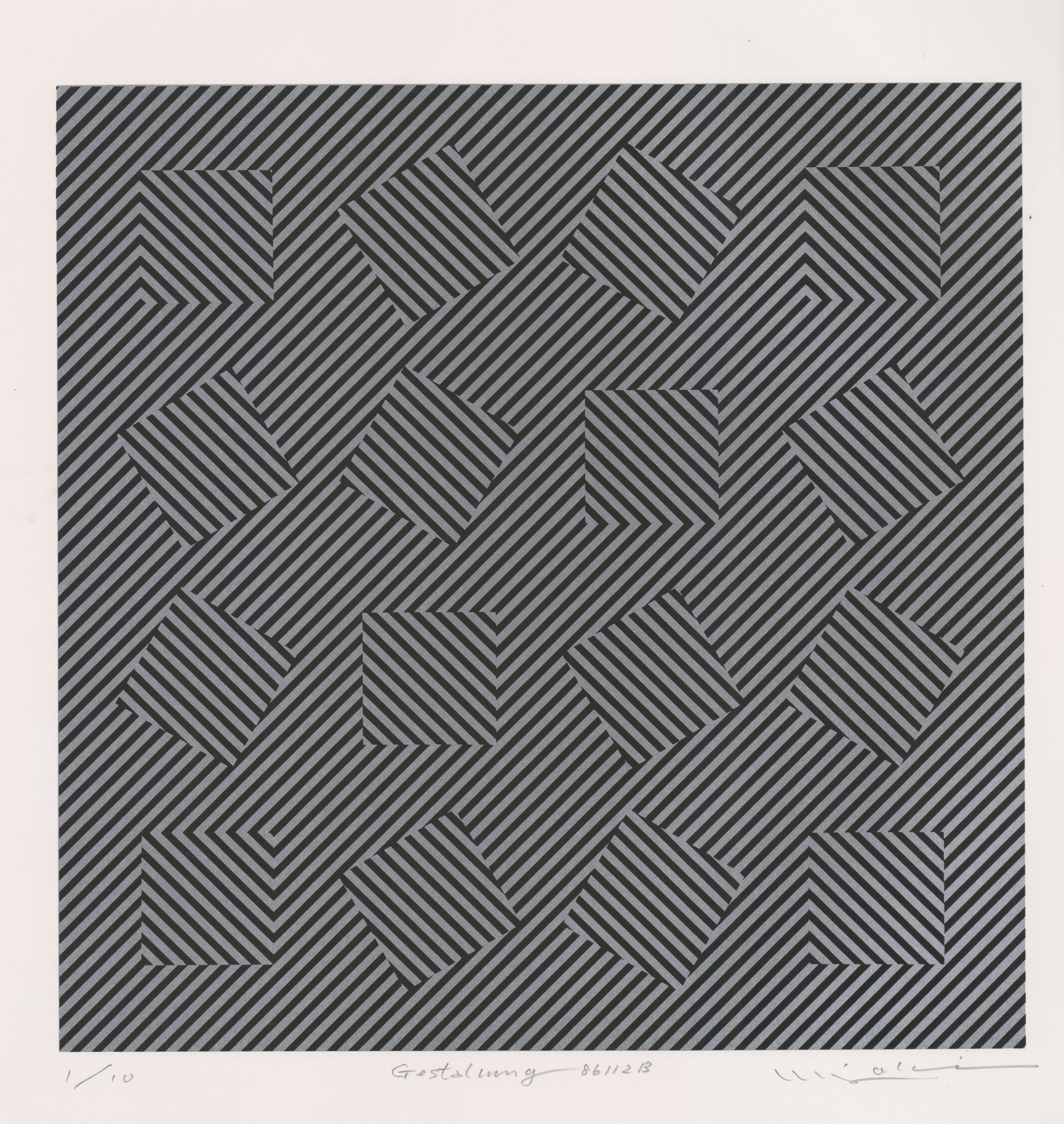 Square; black and silver ink; square with diagonal lines and 16 smaller squares made of diagonal lines inside the largest square Edition: 1/10