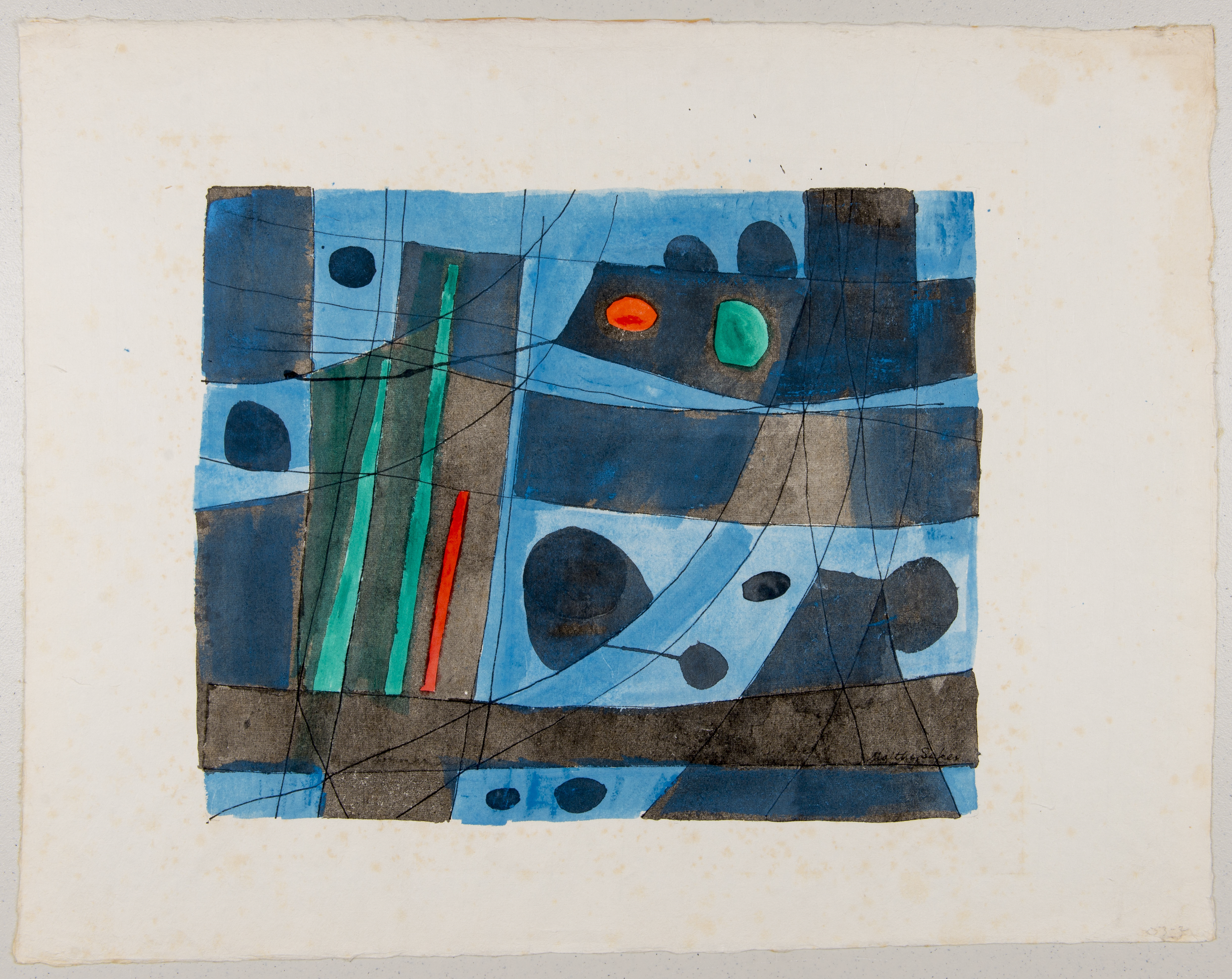 Abstract image of primarily blue and black shapes with red and green accents
