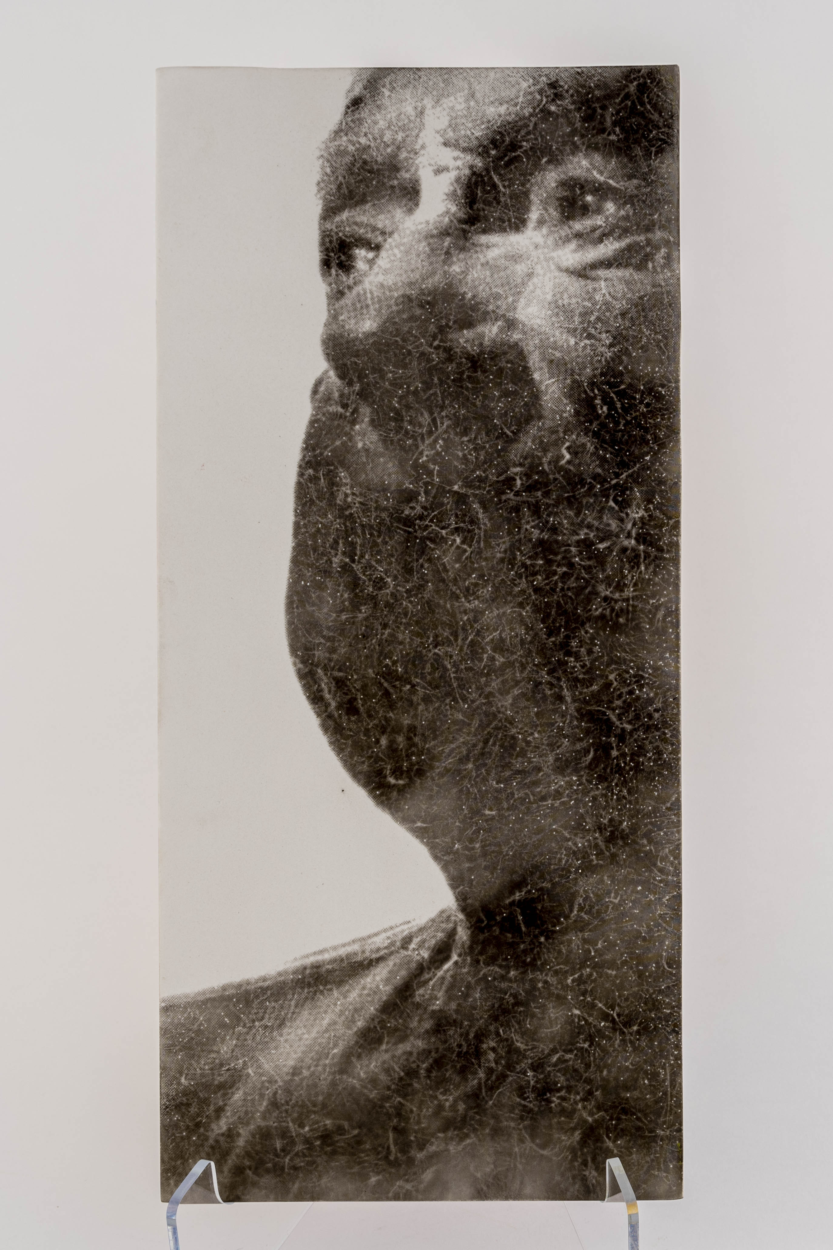 a porcelain tile panel with a black and white image of a face (Hugh Williams) that rests on a small wood shelf painted white.