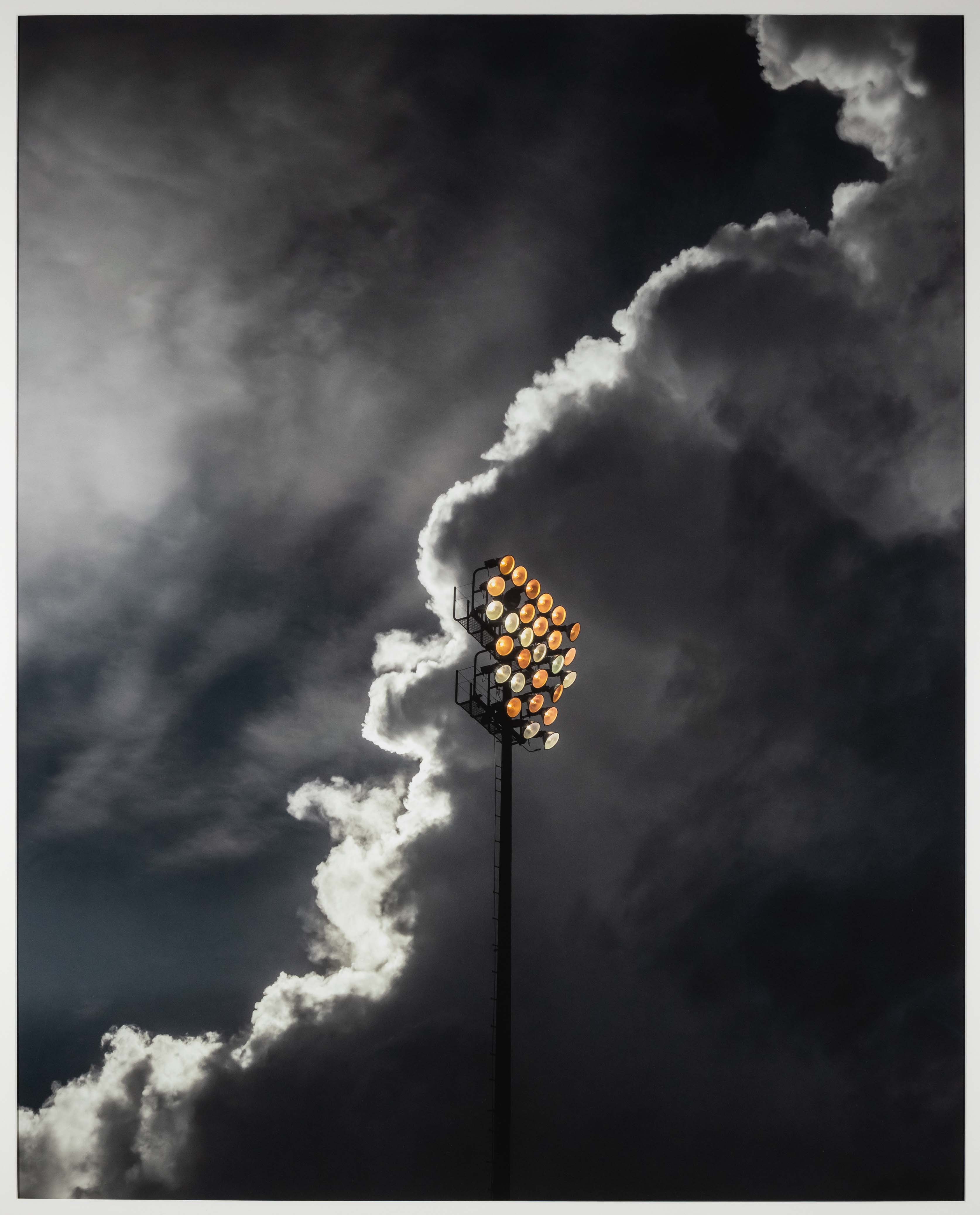 Image of a tall, multi-bulb light pole with storm clouds in background