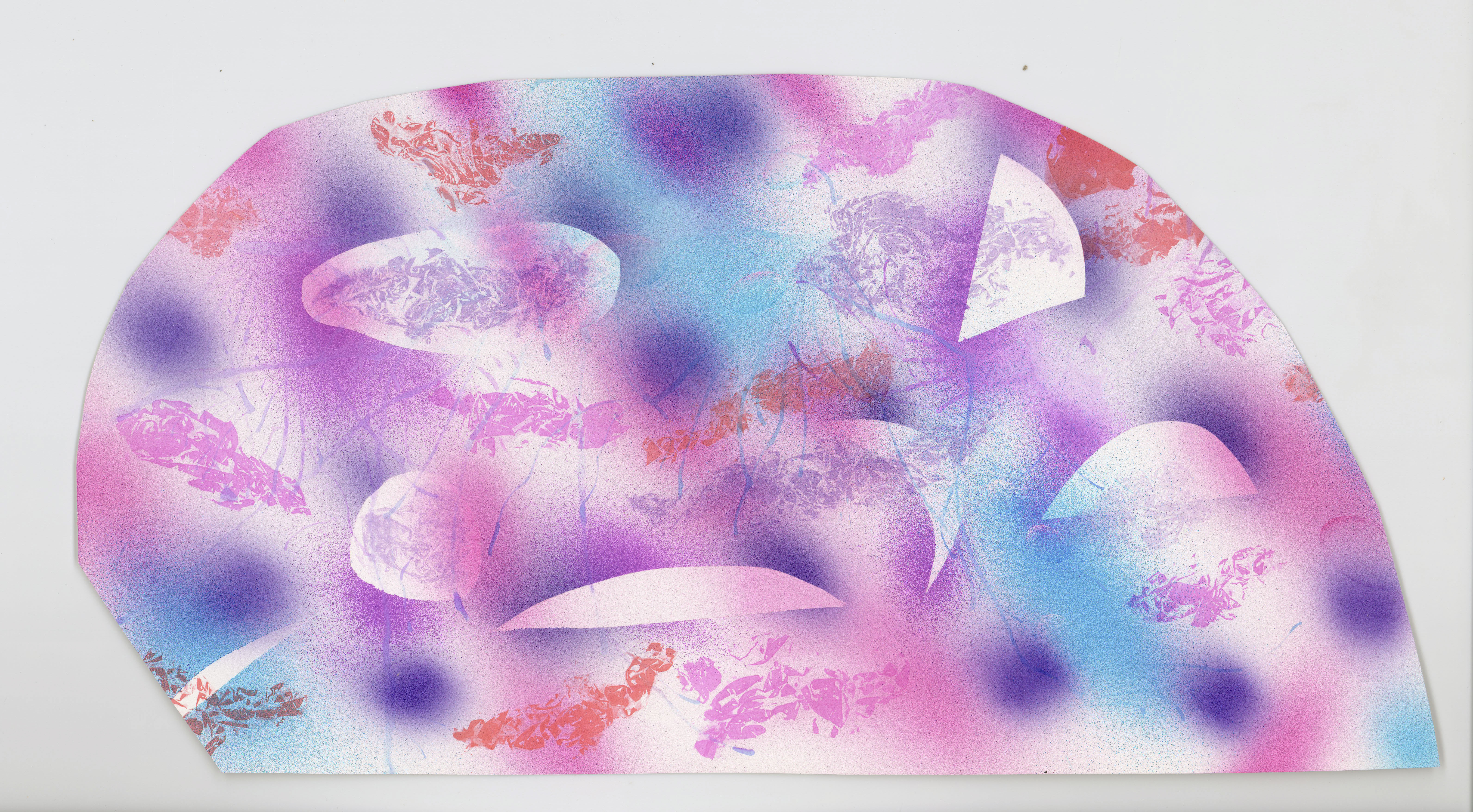 Curved shapes with a flat bottom; pink, purple, and blue shapes stenciled out; pink, purple, and red shapes stenciled in; abstract