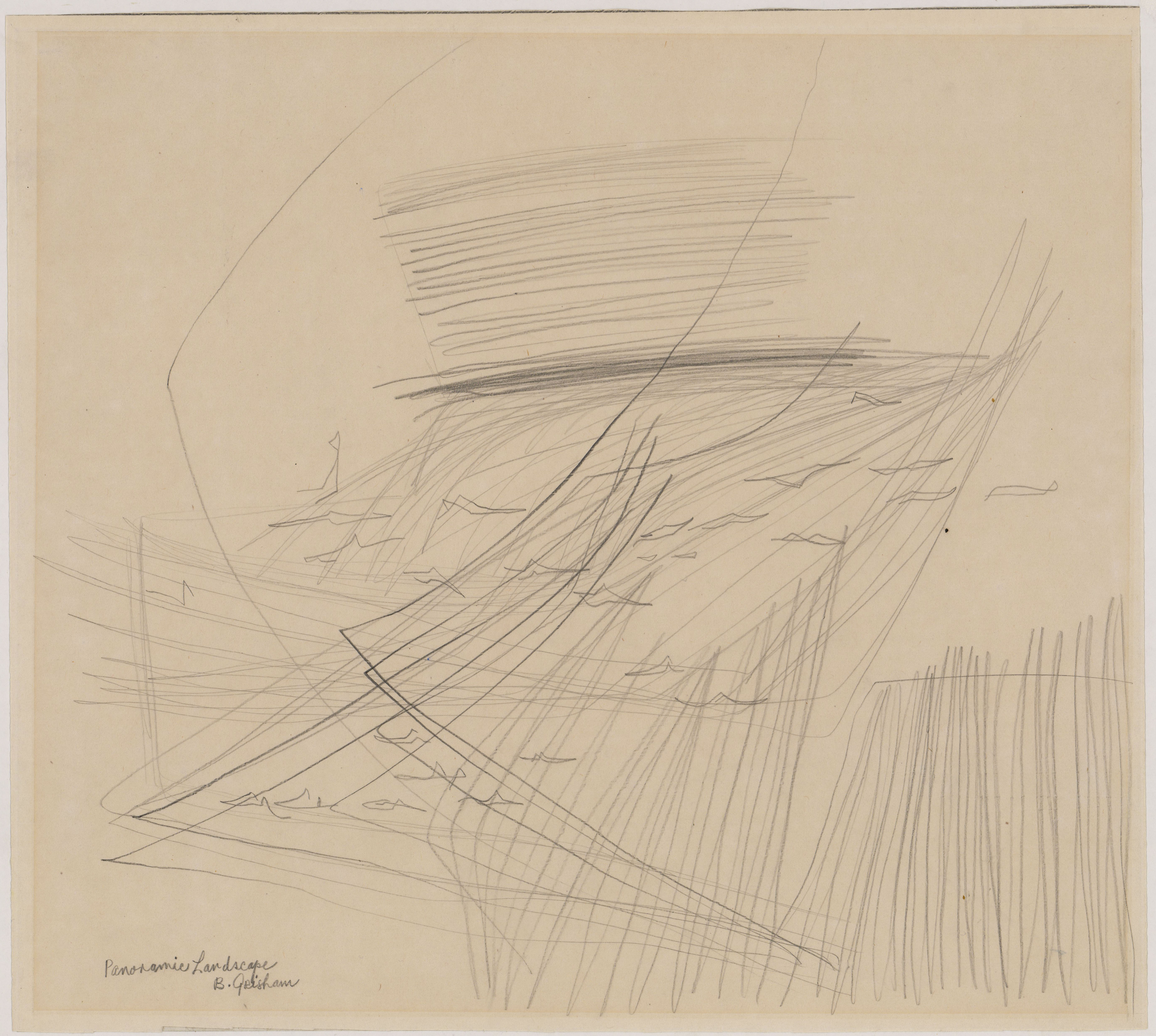Many criss-crossing vertical and horizontal lines done in pencil with abstract bird-like shapes across the middle