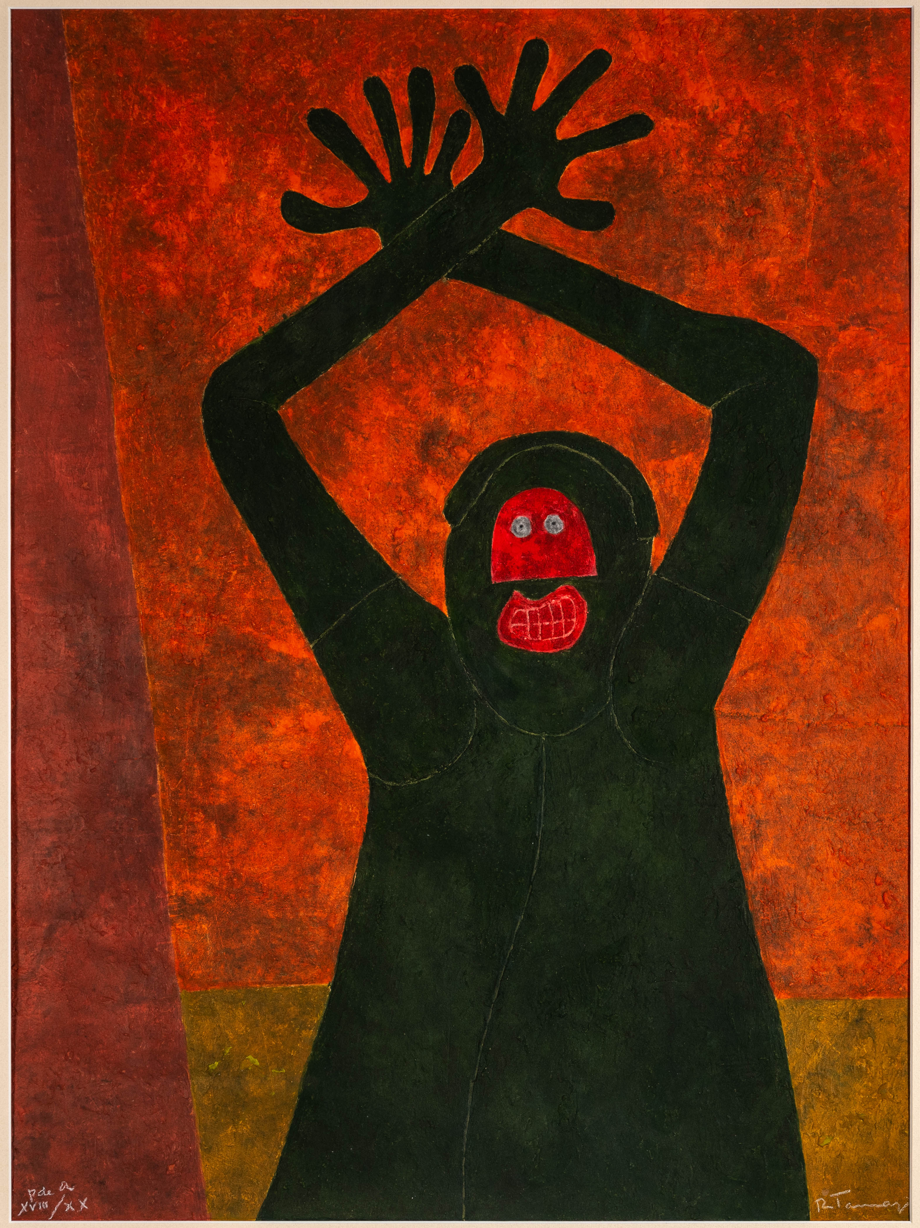 Image of a black figure with arms raised and crossed over his head on a red background Edition: XVIII/XX