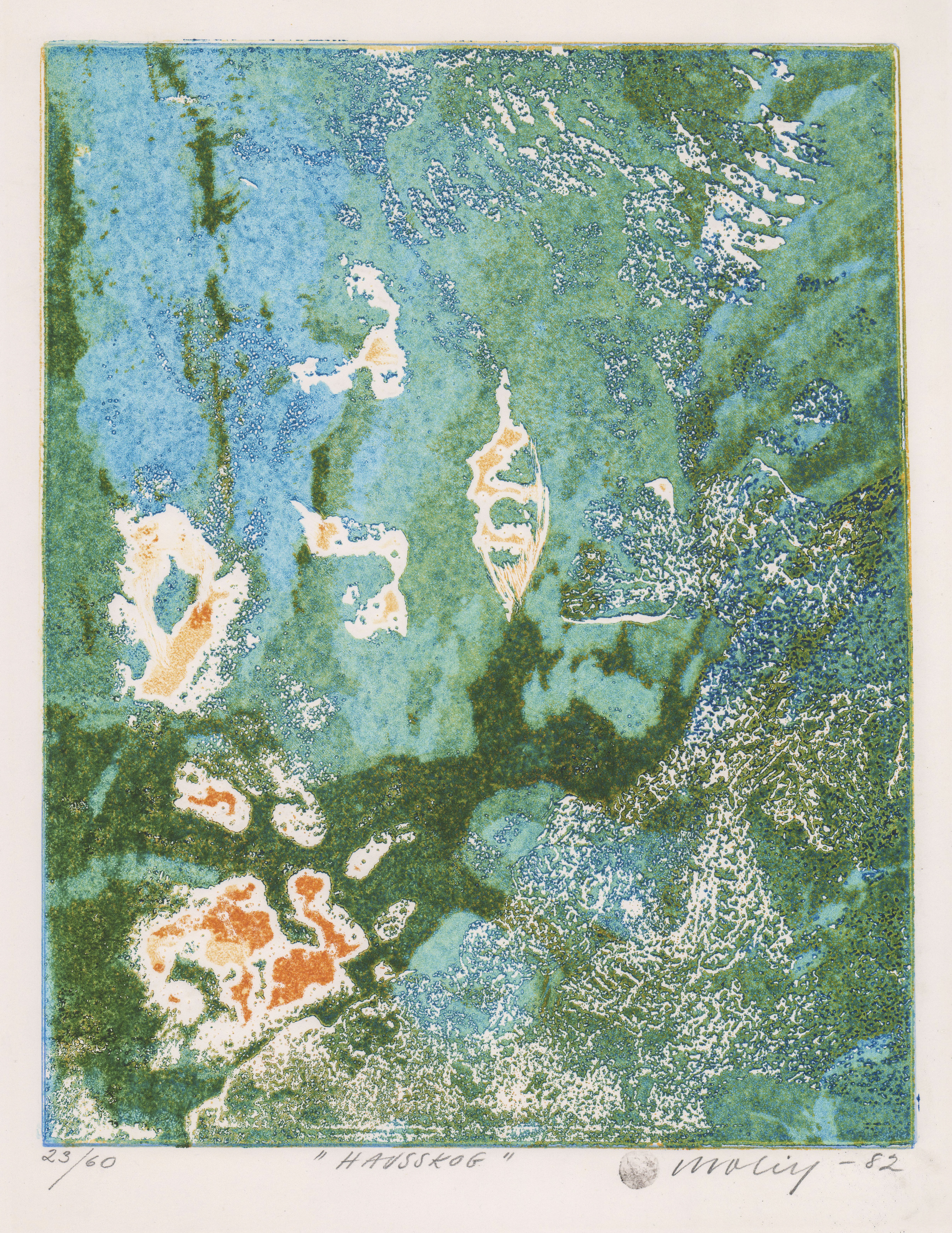 Vertical; green and blue background with white splotches and large orange splotch in the bottom left quadrant Edition: 23/60