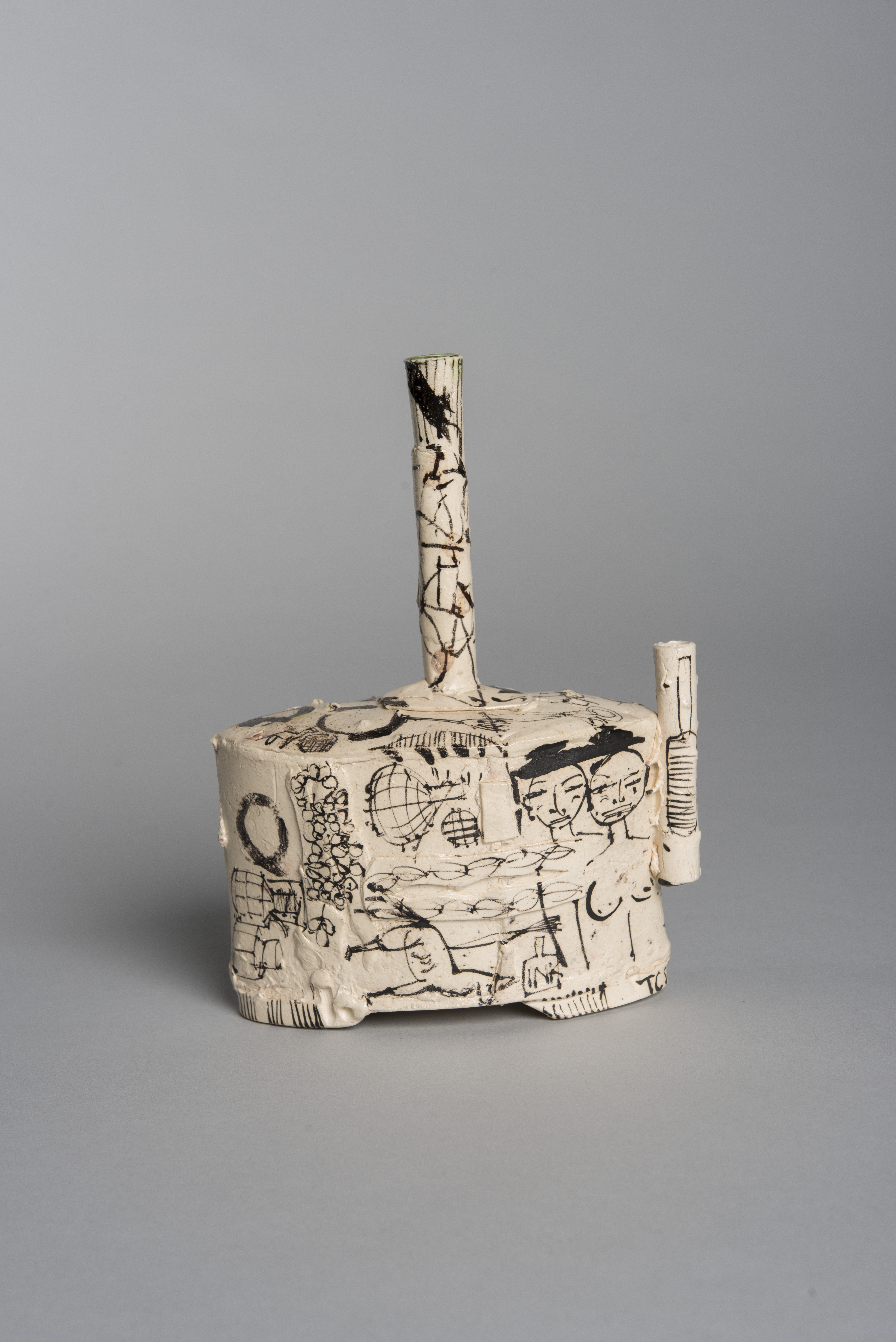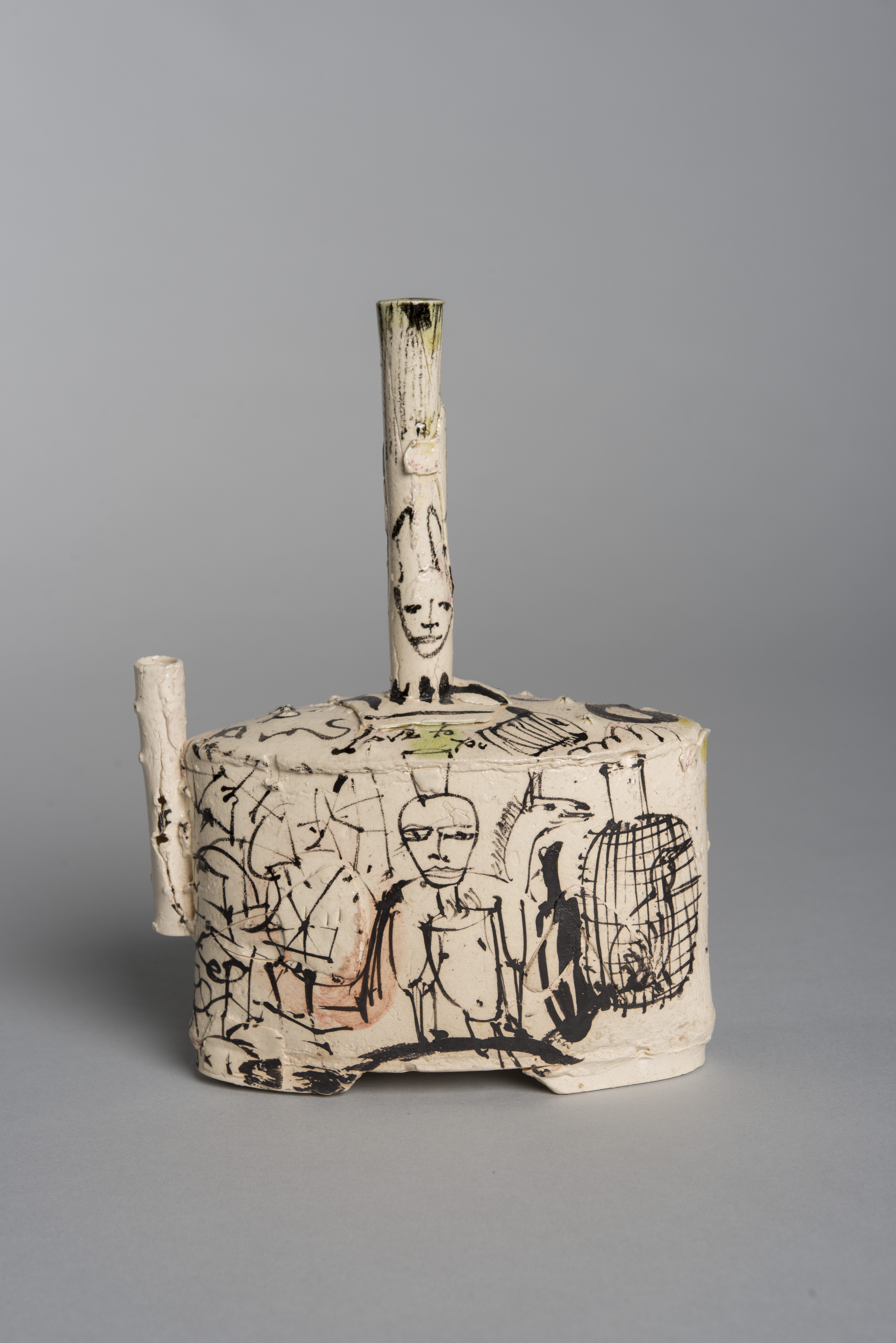 White, non-traditional teapot with black sketch-like designs throughout (human and animal)