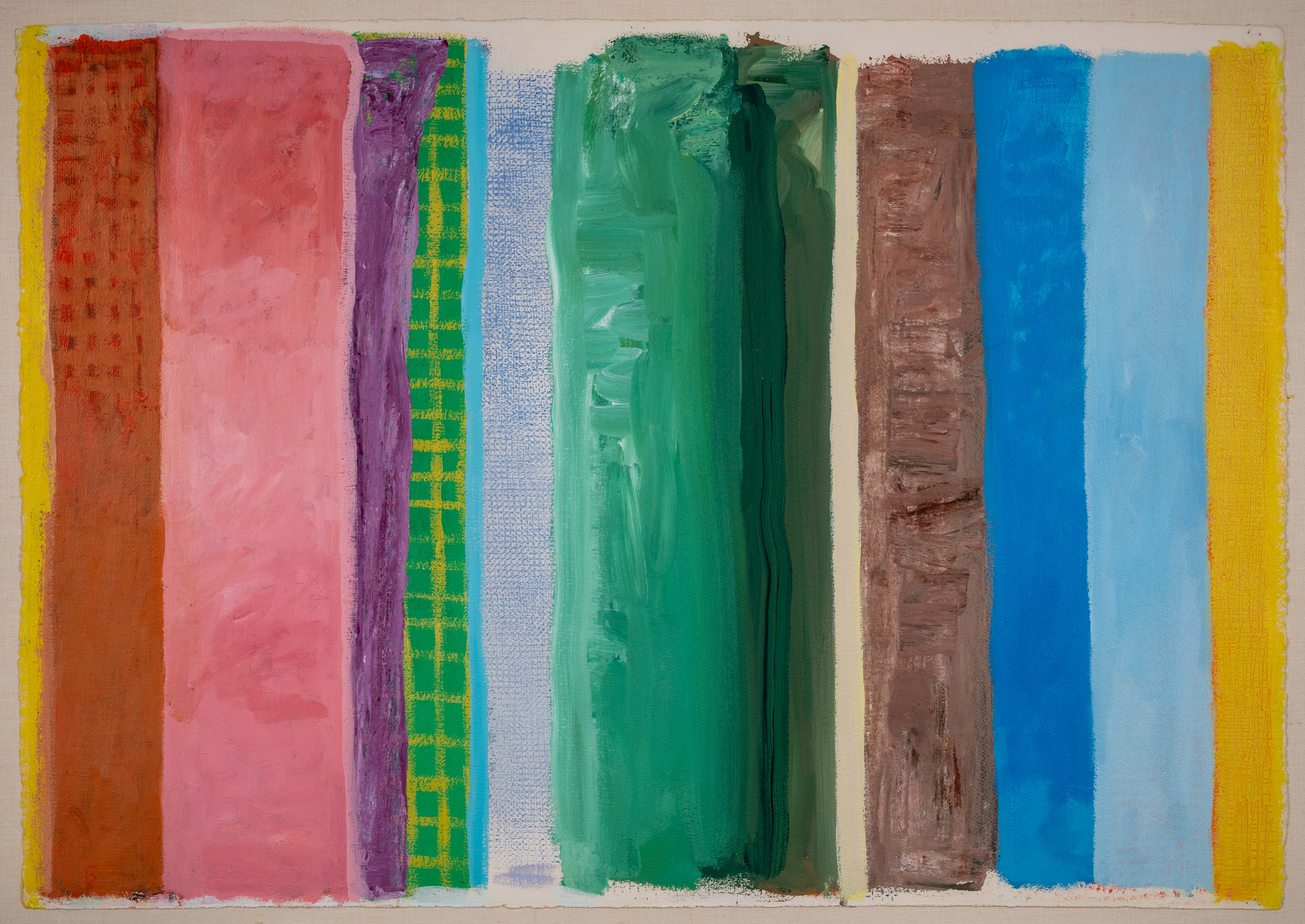 Series of two inch wide, various colored striped painted vertically on paper