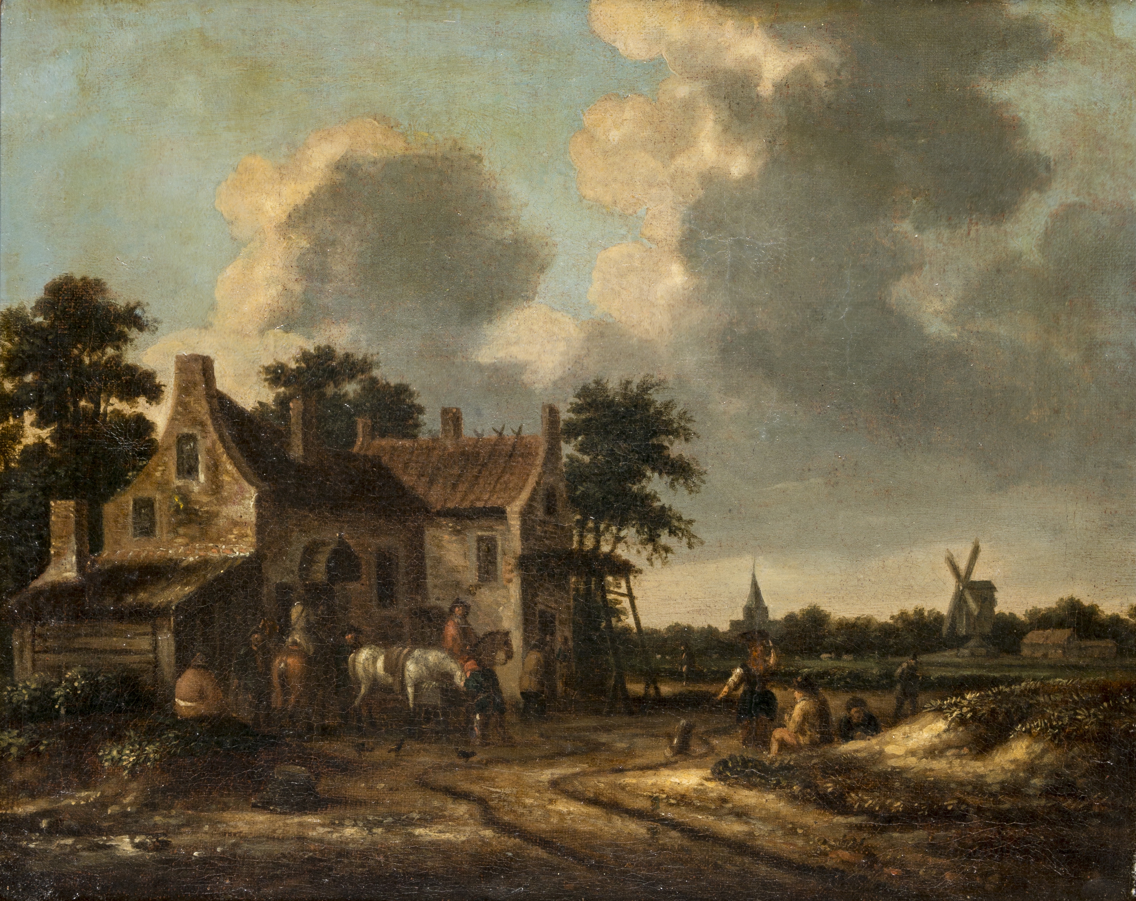 A seventeenth-century genre painting of a Dutch farmer's cottage and family. A windmill and a church steeple are in the background.