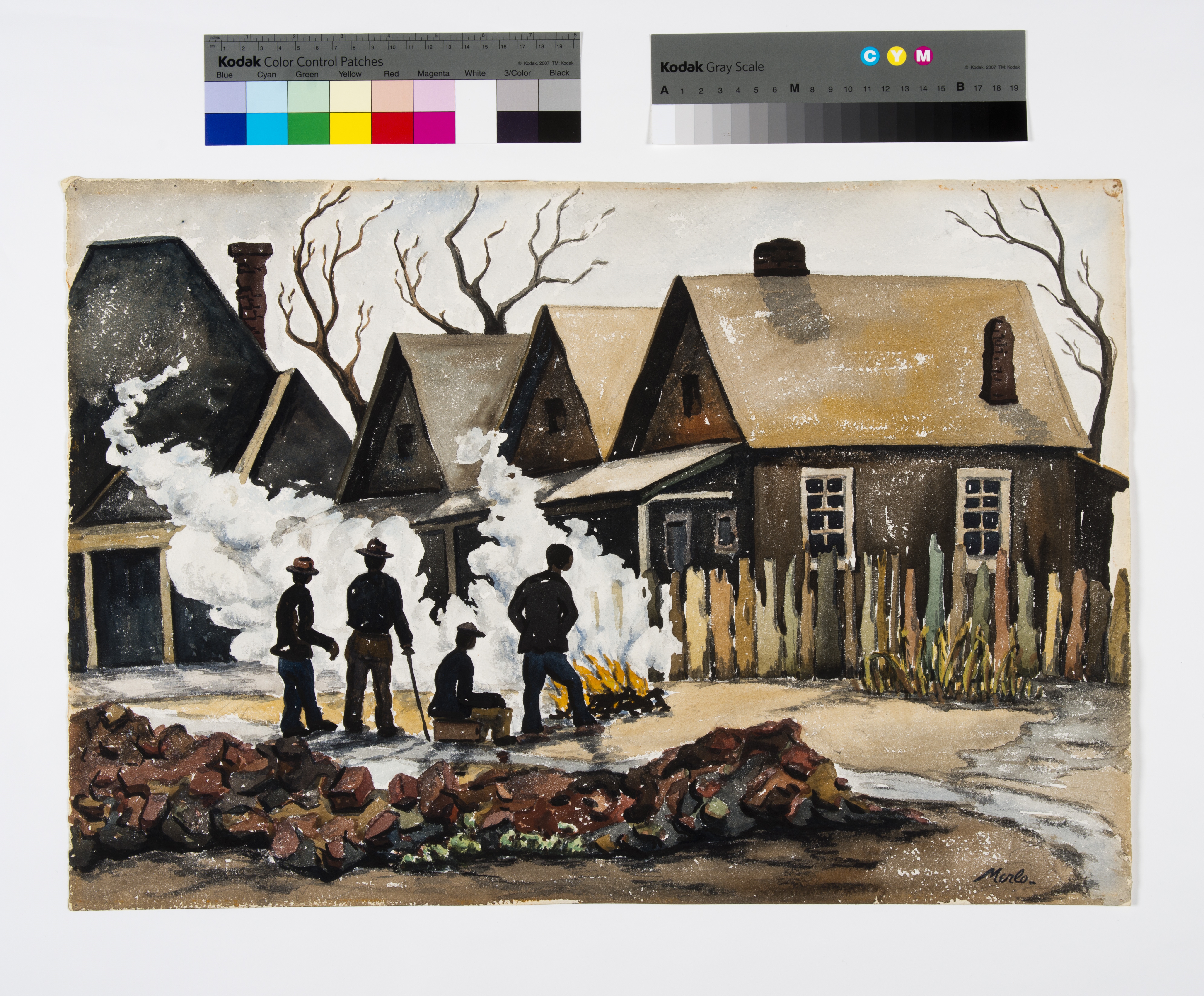 Untitled (Men at a bonfire before a row of mill houses)