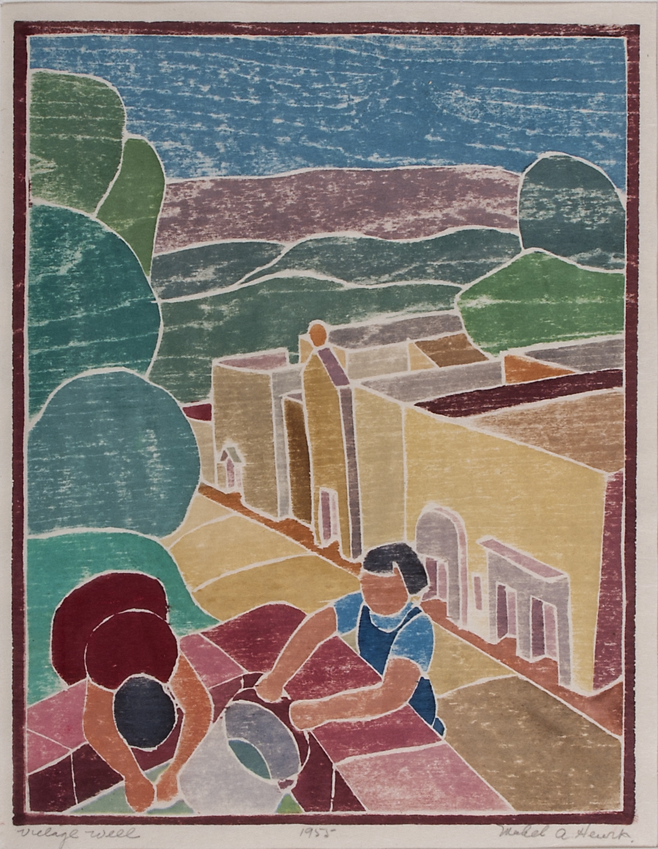 An image of two women at a town well done in greens, yellows, and reds Edition: Unknown, probably 10